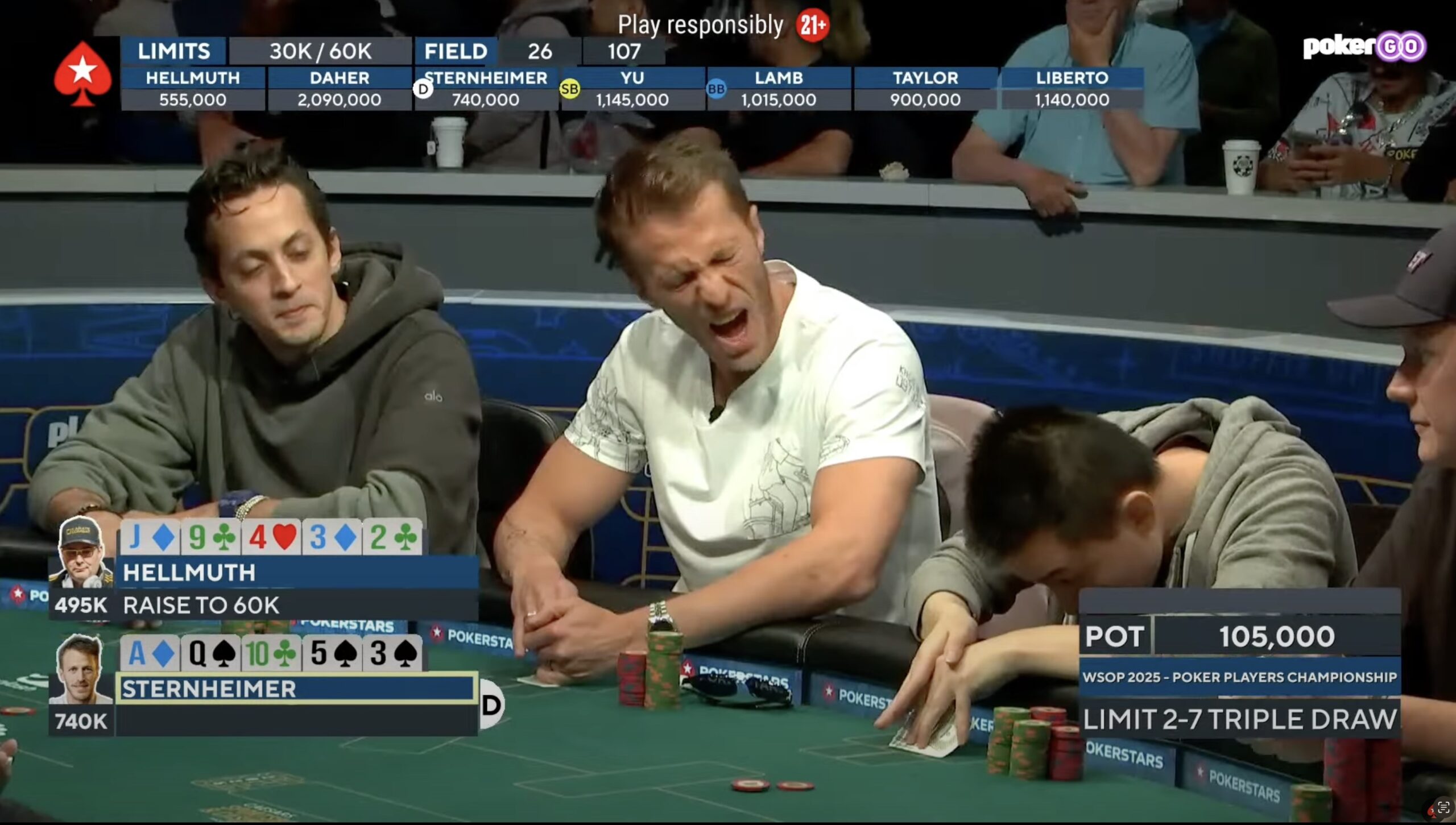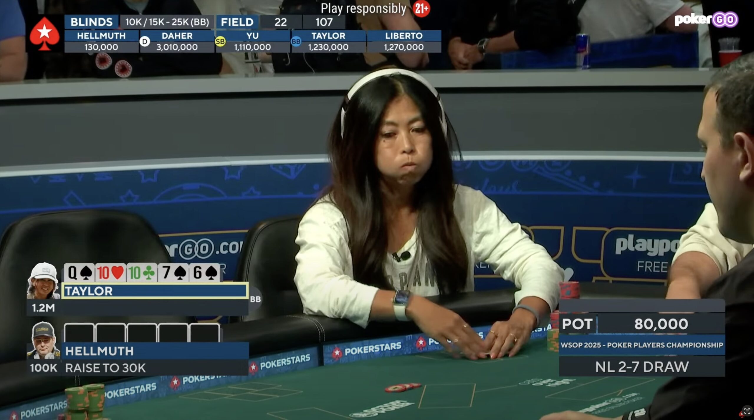 Den Rekord als beste Pokerdame im PPC hatte Esther Taylor bereits von Rang 7 auf Rang 3 hochgeschraubt und lange sah es danach, aus dass ihr ein Platz im Heads-Up nicht zu nehmen sei. Doch in 4 großen Konfrontationen mit Shorstack Bryn Kenney konnte sich dieser nicht nur zurück auf Augenhöhe mit Taylor spielen, sondern sie mit einem Wheel im 2-7 Single Draw auf Rang 3 ($595.136) aus dem PPC werfen.