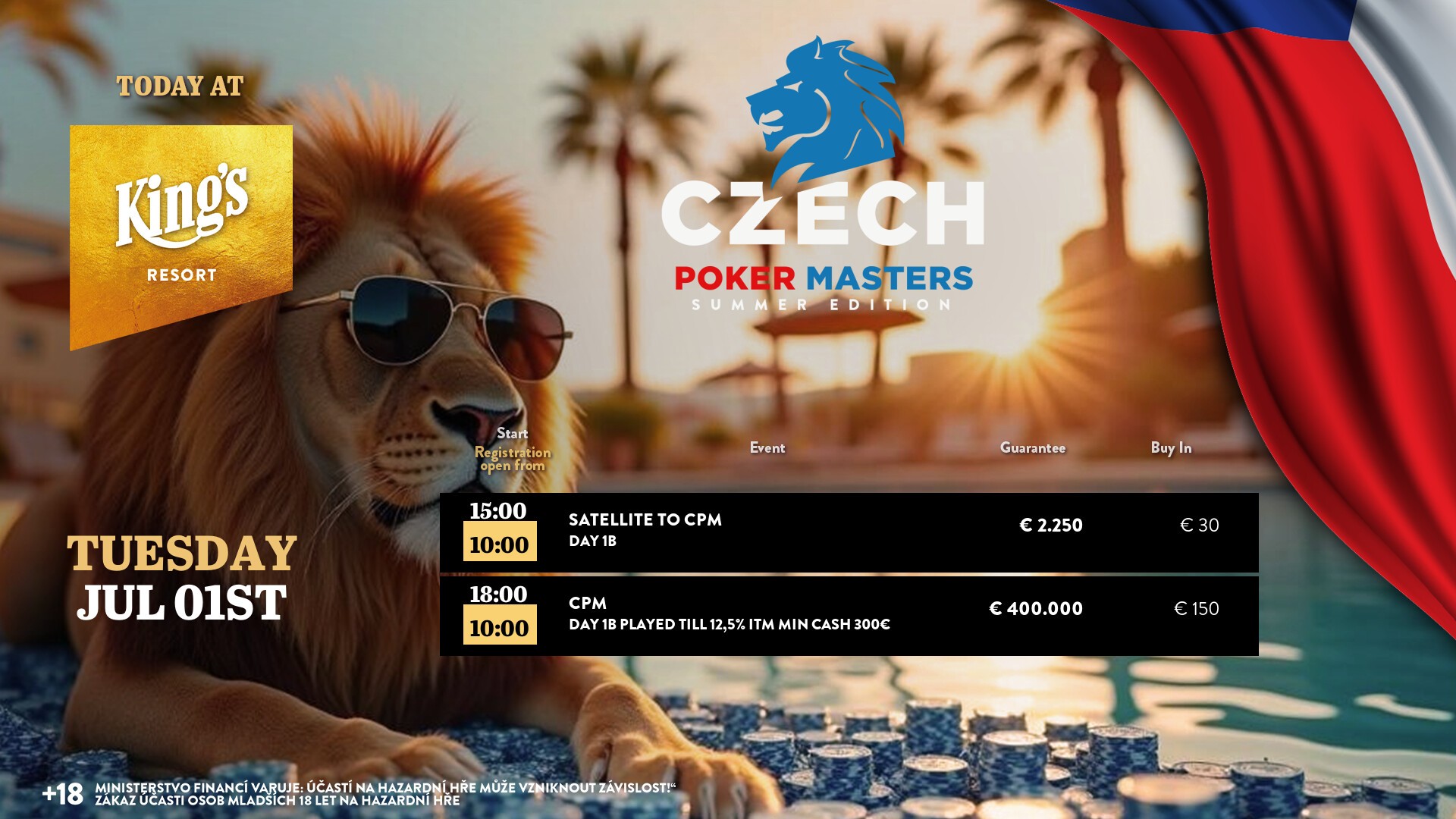 Im King’s Resort geht es heute um 18 Uhr mit Tag 1B der Czech Poker Masters und einem Startgeld von €150 weiter. Wer günstiger mitmachen möchte, kann sich beim €30 Satellite um 15 Uhr eines von 15 garantierten Tickets erspielen.