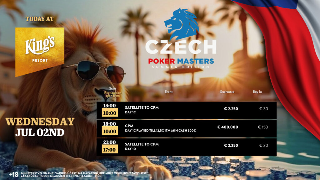 Am Dienstag wurde mit Flight 1B der zweite von insgesamt zwölf Starttagen im Main Event der Czech Poker Masters Summer Edition im King’s Resort Rozvadov ausgetragen. 11 Spieler konnten sich für die Fortsetzung qualifizieren. Einen Chipleader Bonus schnappte sich auch der King’s Regular Igor Fonseca Brito.