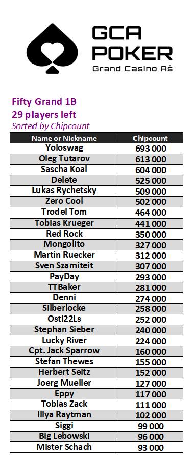 Nachdem an Starttag 1A 115 Entries verzeichnet werden konnte, erschienen am Tag 1B 120 Spieler an den Tischen und bezahlten zusätzlich für 54 Re-Entries. 29 Spieler überlebten den Tag und zogen in das heutige Finale ein, allen voran ein Spieler mit dem Spitznamen ‚Yoloswag‚ mit 693.000 Chips.