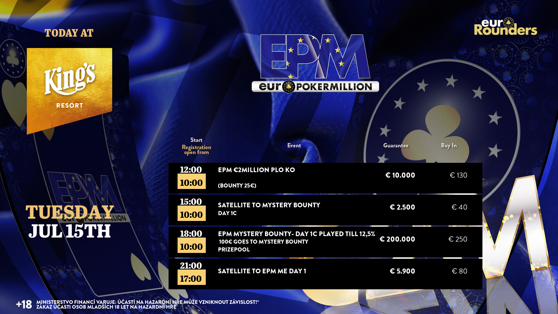 Bei der Euro Poker Million €2 Million Edition powered by euroRounders im King’s Resort Rozvadov wurde der zweite Startflight des Mystery Bounty gespielt, ein Tagesturnier stand auf dem Programm und im King’s Casino in Prag wurde das Big50 gestartet!