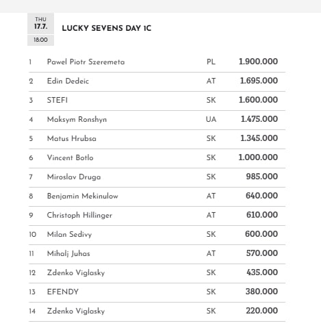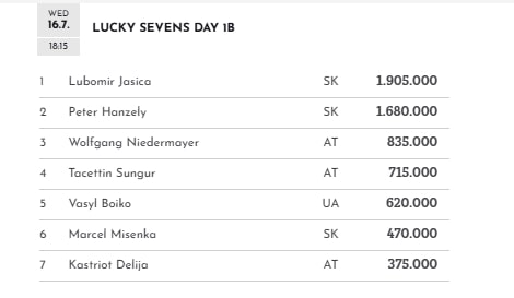 14 von diesen schafften den Sprung in den Finaltag am Sonntag, den 20. Juli um 16:30 Uhr, allen voran der Pole Pawel Piotr Szeremeta mit 1.900.000 Chips. Den Overall-Chiplead hält weiter „Aren“ vom Tag 1a mit 1.915.000.