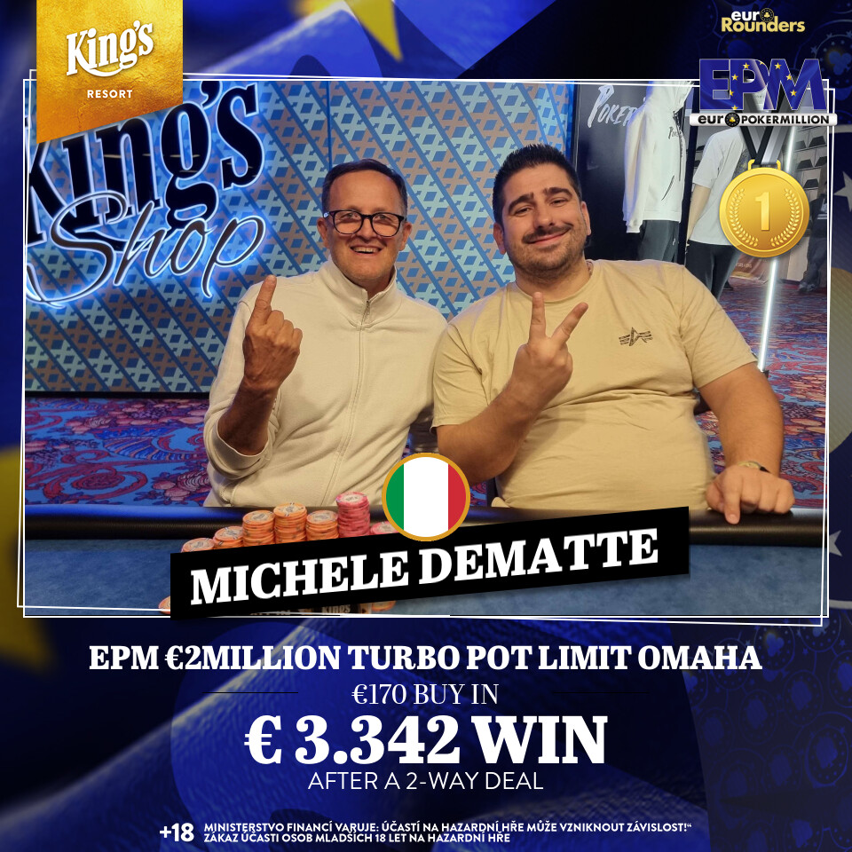 Neben dem €2 Million gtd Main Event der Euro Poker Million (EPM) powered by euroRounders, wurden im King’s Resort Rozvadov das EPM €2Million Turbo Pot Limit Omaha und das King’s Friday Night Turbo Tournament ausgespielt. Parallel wurde im King’s Casino Prague Tag 1E vom BIG50 powered by PokerMan.cz ausgetragen.