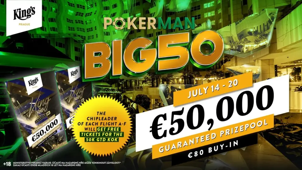 Im Hilton Hotel Prag, wo das King’s Casino Prague beheimatet ist, wurde am Freitag mit Tag E der 5 von 8 Flights (7 Starttage + 1 Flip and Go) im BIG50 gespielt. Für nur €80 Startgeld wird in der tschechischen Hauptstadt mindestens um die namensgebenden €50.000 im garantierten Preispool gespielt. Dabei hat man nicht nur die Chance mit dem Sprung unter die besten 10% den Finaltag (SO, 17:00 Uhr) zu erreichen – was bereits mit €160 Mincash verbunden ist – sondern auch €500 Chipleader Bonus (KoK King of King’s Ticket) zu erspielen.