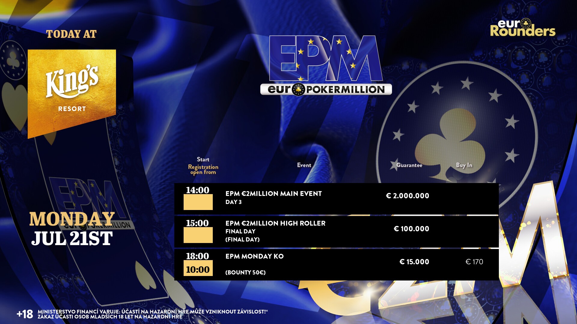 Bei der Euro Poker Million (EPM) powered by euroRounders im King’s Resort Rozvadov wurde gestern neben dem Main Event auch das EPM Highroller ausgetragen. Und auch im King’s Casino Prag wurde gepokert.