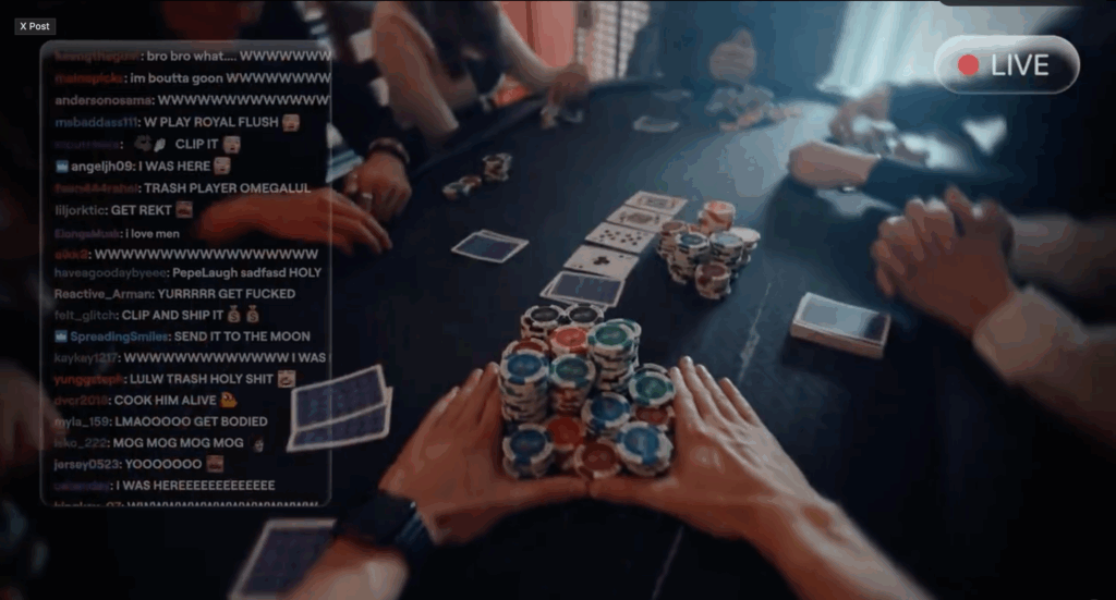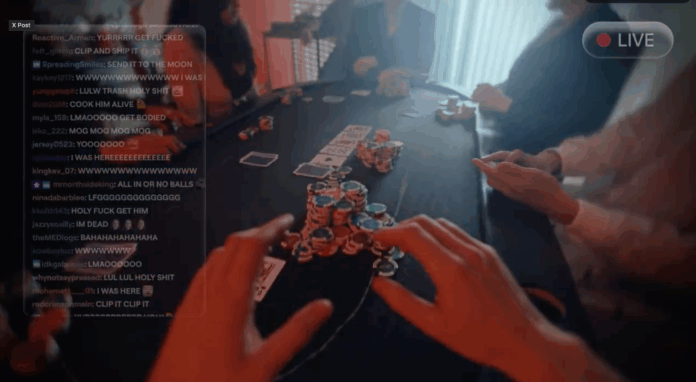 Der Protagonist im Clip speichert ohne Erlaubnis diverse Momente, die er mit seiner Brille „Waves“ aufgenommen hat, und nimmt dann in einem ziemlich random High Stakes Cash Game Platz – während er mit seinen Smart Glasses live streamt und den Chat auf seiner Smart Watch liest – während einer laufenden Hand.