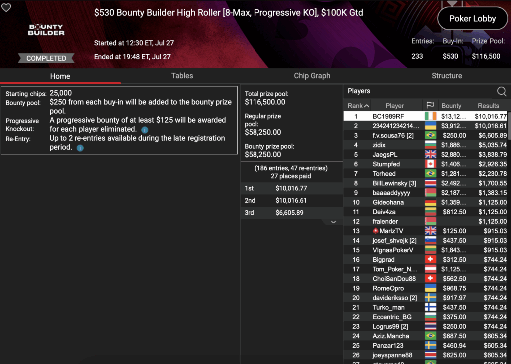 Fangen wir an mit den beiden Bounty Builder High Roller Turnieren. Im $530 Bounty Builder High Roller ($100k GTD) gab es 233 Entries und somit einen $116.500 Preispool. ‚BC1989RF‚ aus Irland konnte den Großteil davon mit nach Hause nehmen. Er erhielt für den Sieg $10.016 plus $13.120 an Bounties.
