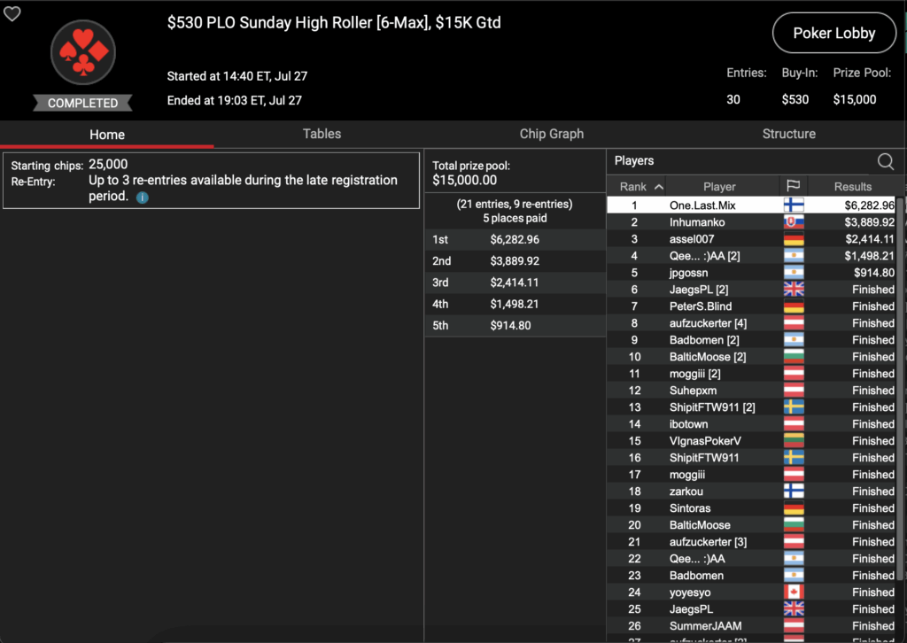 Für alle 4-Karten Liebhaber unter den High Rollern gab es gestern auch Action mit dem $530 PLO Sunday High Roller ($15k GTD). 30 Entries bedeutete die exakte Deckung der Garantie und einen $6.282 Top-Preis. Dieser wurde vom Finnen ‚One.Last.Mix‘ abgestaubt.