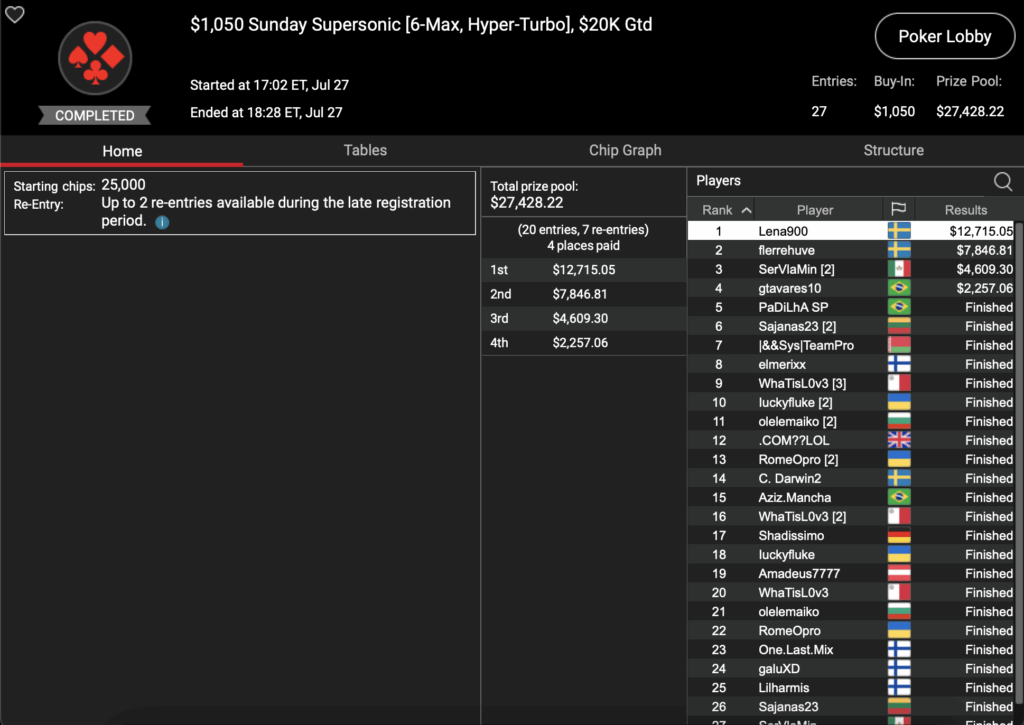 Im $1.050 Sunday Supersonic ($20k GTD) schufen 27 Entries einen Preispool von $27.428 und hier was es kein Geringerer, als der schwedische Superstar Niklas ‚Lena900‘ Astedt, der den Top-Preis von $12.715 mit nach Hause nehmen konnte.