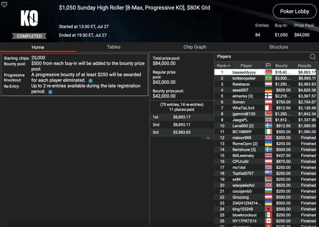 Im $1.050 Sunday High Roller ($80k GTD) schufen 84 Entries einen $84.000 Preispool. Elf Spieler bekamen einen Anteil davon ab und der Großteil ging an den Weißrussen ‚baaaadddyyyy‚. Dieser konnte für den Sieg $8.893 plus saftige $18.400 kassieren.