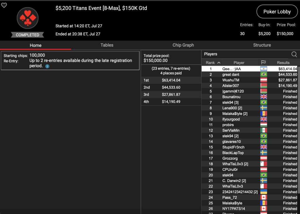 Das $5.200 Titans Event ($150k GTD) war das größte Buy-in Event des gestrigen Spieltages und hier waren es genau genug Entries, um die Garantie zu erreichen. Der $150.000 Preispool wurde auf die Top vier Spieler verteilt und wir hatten mit Thomas ‚WushuTM‘ Mühlöcker einen DACH-Vertreter auf Platz 3. Dafür erhielt er immerhin noch $27.861. Platz 1 wurde belegt vom Argentinier ‚Qee… :)AA‘ für $63.414.