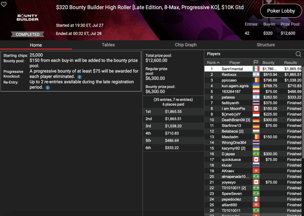 In der $320 Late Edition ($10k GTD) des Turniers nahmen 35 Spieler an den virtuellen Tischen Platz und bezahlten außerdem für sieben Re-entries. Dies ergab einen Preispool von $12.600, der auf die Top 6 verteilt wurde. Hier war es der mexikanische Spieler ‚Sent1mental‚, der den Top-Preis von $1.865 plus $1.785 an Bounties einstrich.