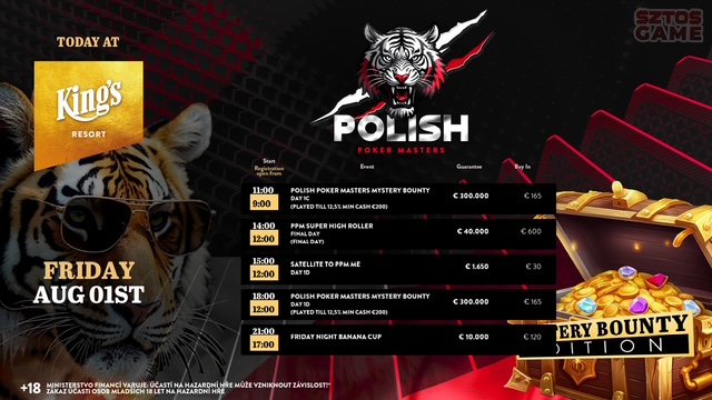 Neben dem Polish Poker Masters Mystery Bounty Main Event powered by SZTOS.Club wurde gestern im King’s Resort das The Gambler$ PLO 5card und Super High Roller gespielt. Im King’s Casino Prag wurde zudem ein Mystery Bounty gezockt!