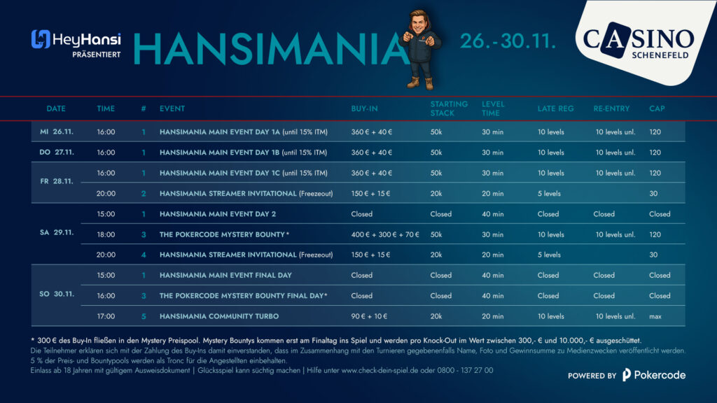 Im Mittelpunkt steht natürlich das €360+40 HANSIMANIA Main Event mit drei Starttagen direkt vom 26. bis 28. November jeweils um 16:00 Uhr. Gespielt wird mit 50.000 Start Stack und 30 Minuten Blinds. Alle Überlebenden aus den Tagen 1 werden dann am Samstag, den 29. November für den Tag 2 an die Tische zurückkehren und das Finale wird am Sonntag, den 30. November ausgespielt.