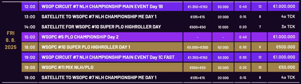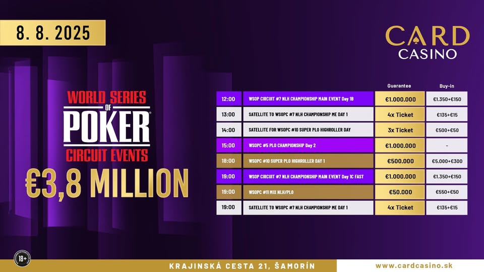 Im Card Casino Samorin (SK) wurde am gestrigen Donnerstag neben dem Finale des €3k High Rollers im Rahmen der World Series of Poker Circuit (WSOPC) auch der Tag 1A des €1500 Main Events, das €750 6-Max, der Tag 1C des €2.500 PLO Championship und das €350 Ladies Night ausgespielt.