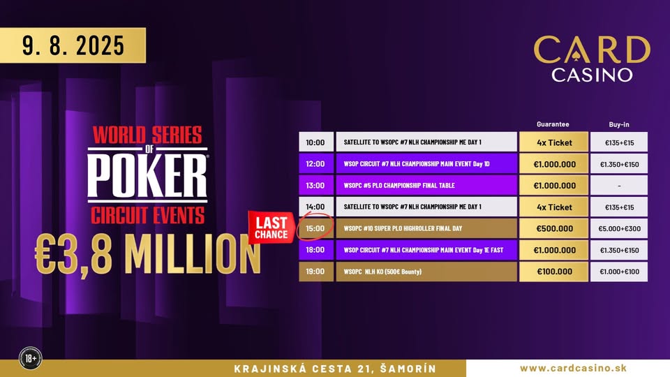Im Card Casino Samorin (SK) wurden am gestrigen Freitag im Rahmen der World Series of Poker Circuit (WSOPC) der Tag 1B und Tag 1C Fast des €1.500 Main Events angeboten.