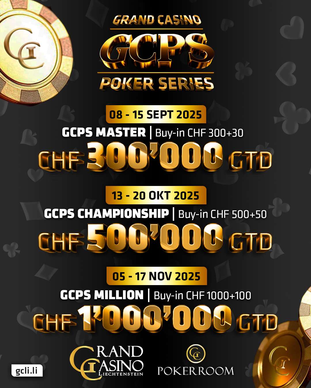 Nachdem es zuletzt etwas ruhiger im GC Pokerroom war, wurde für September, Oktober und November die Grand Casino Poker Series mit über CHF 2.000.000 GTD im Grand Casino Liechtenstein (GCLi) angekündigt.