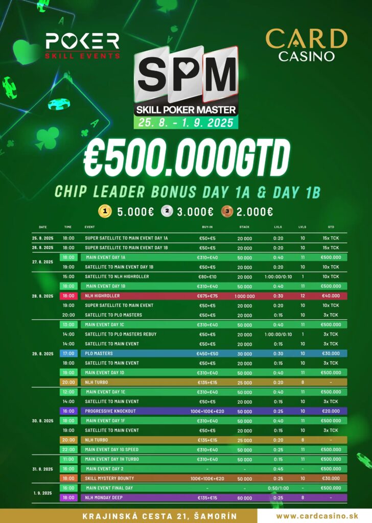Im Card Casino Samorin (SK) geht es nach dem Abschluss des WSOP Circuits auch schon bald weiter mit dem nächsten Festival Highlight. Vom 25. August bis 1. September wird hier nämlich erneut das Skill Poker Master Festival angeboten.