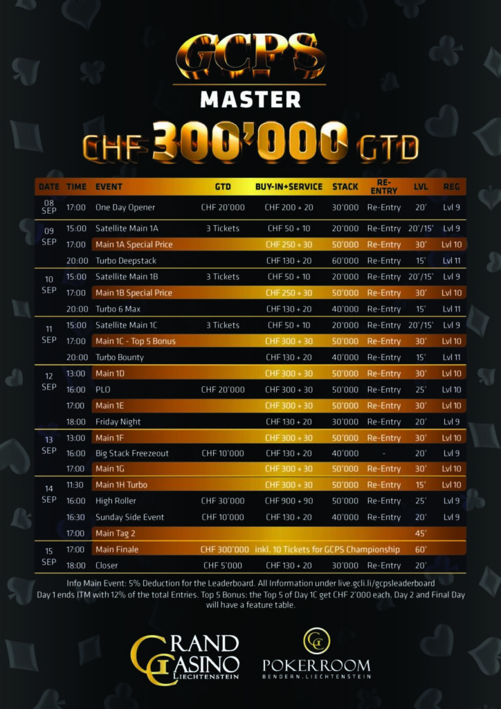 Im Grand Casino Liechtenstein (GCLI) wird es vom 8. bis 15. September das erste Event der dreiteiligen Grand Casino Poker Series geben. Der zweite Teil läuft vom 13. bis 20. Oktober und der dritte vom 5. bis 17. November. Insgesamt werden über die Serie CHF 1.800.000 garantiert.