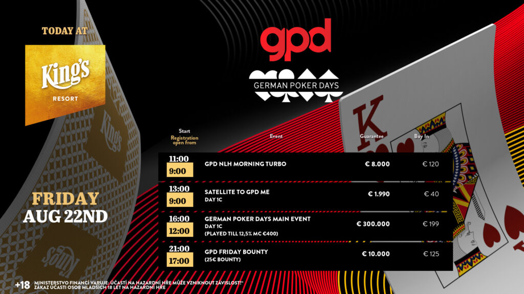 Am Donnerstag gab es im King’s Resort Rozvadov im Rahmen der German Poker Days (GPD) powered by gpd, mit Flight 1B die zweite von sieben Qualifikationsmöglichkeiten für das Finale. Neben einer guten Ausgangsposition im Kampf um den mindestens garantierte €300.000 schweren Preispool ging es bereits um den Mincash von €400 und einen €900 Chipleader Bonus für die Top-2!