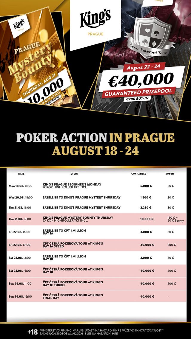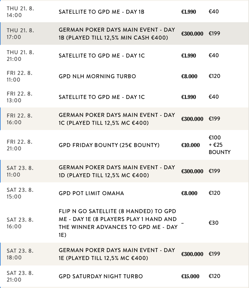 Das Main Event der German Poker Days ist berühmt und berüchtigt für riesige Teilnehmer*innenfelder, große Preispools für kleines Startgeld, einen äußerst krummen Buy-In Betrag in Höhe von €199 (€174+€25) und ein echtes Marathonfinale, das in dem 2-Event nicht selten bis Montagmittag andauert. Um den Sprung in den zweiten und damit auch finalen Tag zu schaffen, gibt es 6 Starttage (1A bis 1F), sowie ein Flip&Go. Jeweils die besten 12,5% eines Flights qualifizieren sich für das Finale (SO, 17:00 Uhr), bzw. damit auch jede*r Achte im Flip&Go. Mit der Finaltagteilnahme ist man bereits in-the-money angelangt und mindestens €400 Mincash sicher. – Für die beiden bestplatzierten eines jeden Spieltages gibt es aus dem Preispool jeweils noch einen Chipleader Bonus. Der besteht aus King’s Main Event Tickets im Gesamtwert von jeweils €900. Gespielt wird mit 50.000 Starting Chips in 30-minütigen Levels (Turbo: 12 Minuten). Im Preispool liegen mindestens garantierte €300.000, worin 3 WSOPE Main Event Tickets à €10.350 enthalten sind.