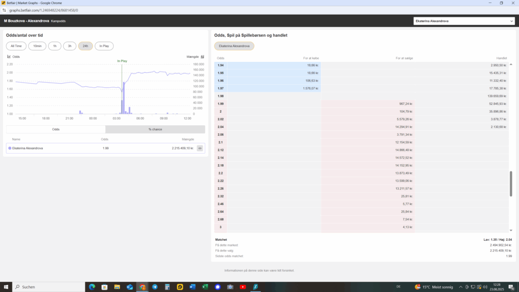 In Monterrey, Mexiko, hat das schlechte Wetter das Halbfinale zwischen der Nummer 14 der Welt, Ekaterina Alexandrova, und der Nummer 53, Marie Bouzkova, unterbrochen. Der Spielstand lautet 2-2 und 0-15. Die Wettquote auf Alexandrova ist in den letzten 8 Stunden von 1.80 vor dem Spiel auf 1.99 gestiegen. Um Geuner und anderen „Hatern“ einen Gefallen zu tun, habe ich mir die Mühe gemacht und ein Screenshot gemacht. In meinen Augen verstehe ich diese Quote überhaupt nicht, und deswegen sehe ich diese Wette als „Wette des Monats“.