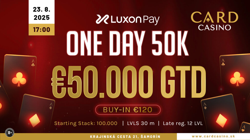 Im Card Casino Samorin (SK) wurde gestern das €120 „One Day 50k“-Turnier, präsentiert von Luxon Pay, angeboten.