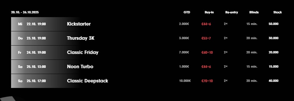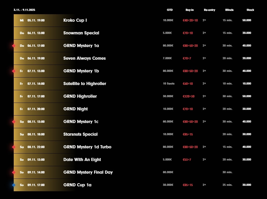 Am gestrigen Samstag standen im Grand Casino As (GCA) gleich zwei Turniere an – das €44+6 Noon Turbo mit einer €1.000 Garantie und das €70+10 Classic Deepstack mit einer €10.000 Garantie.