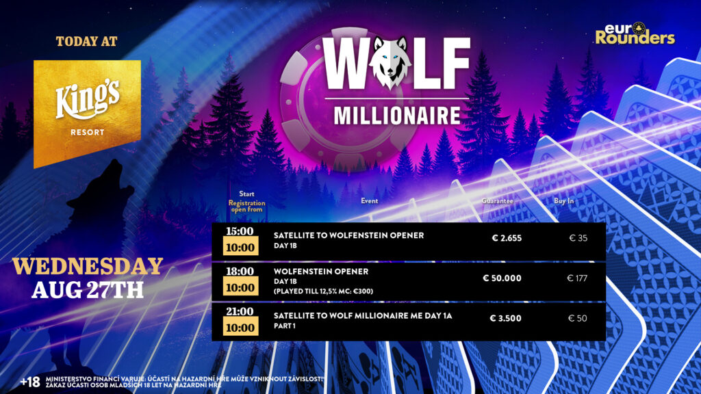 Das WOLF Millionaire powere by euroRounders Festival feierte am Dienstag seinen Auftakt im King’s Resort Rozvadov mit Tag 1A vom WOLFenstein Opener. Dabei nahmen nicht nur viele Regulars an den Pokerroom King’s Turniertischen Platz, sondern sie tauchten auch unter den 7 Tag-2-Qualifikanten auf. Die beiden erfolgreichsten Chipsammler sollten zum sicheren €300 Min-Cash auch noch jeweils den €900 Chipleader Bonus erhalten!