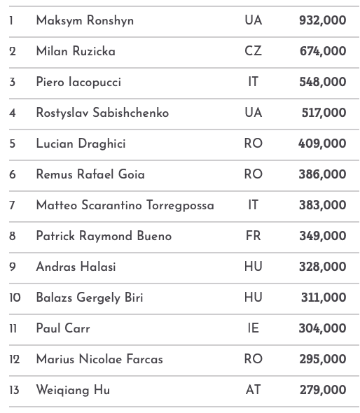 | Day 2 | 778 | 122 | Maksym Ronshyn: 932.000 |