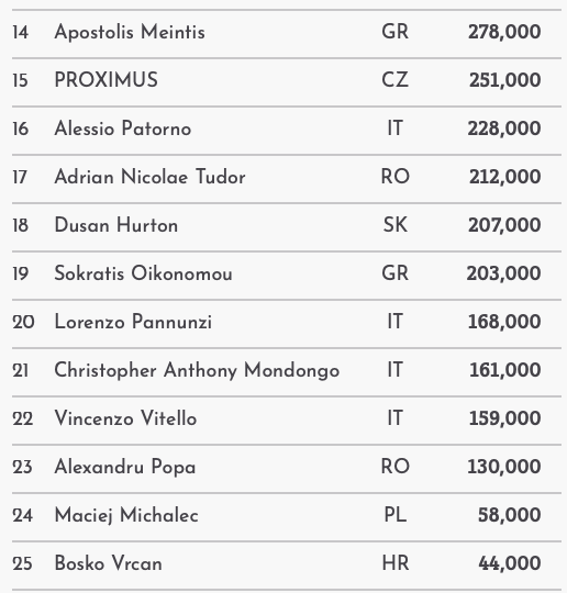 | Day 1D | 156 | 25 | Maksym Ronshyn: 932.000 |