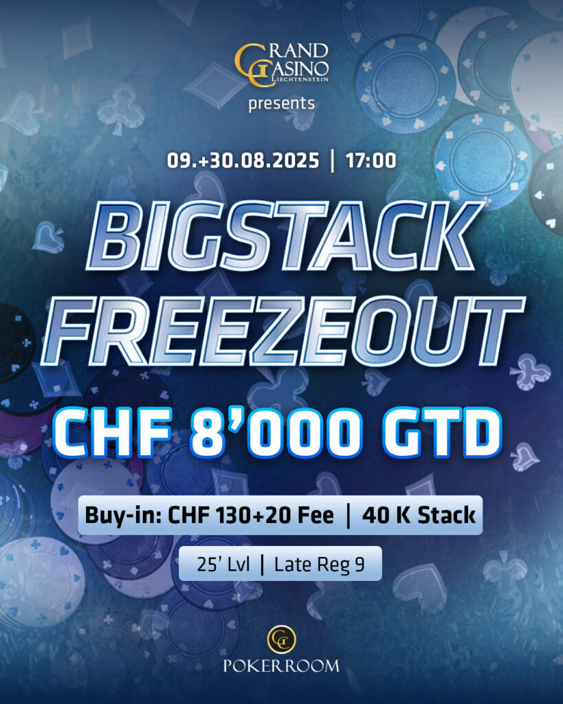 Den Weg an die Turniertische im Grand Casino Liechtenstein (GCLI) hatten am Samstag 88 Spieler*innen gefunden. Für 130+20 CHF Startgeld gingen sie ohne Netz und doppelten Boden in das Bigstack Freezout Wochenturnier. Auf diejenigen, die es unter die Top-11 schaffen würden wartete ein 11.440 CHF Preispool, deutlich größer als die urspüngliche 8k-Garantie. Der Mincash sollte 285, die Siegprämie 3.150 Schweizer Franken betragen.