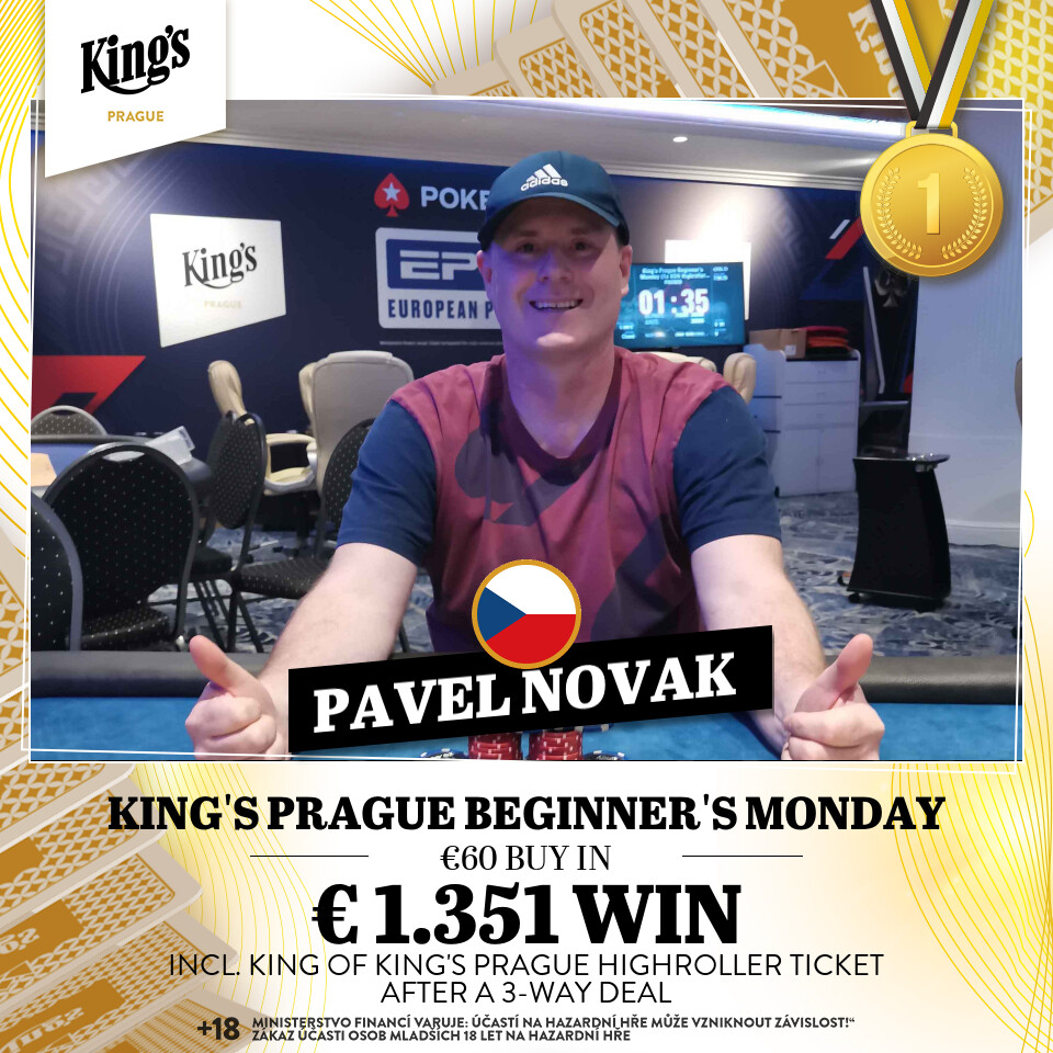 Mit einstiegsfreundlichen €60 Startgeld ging es ab 18:10 Uhr im Hilton Hotel Prag, wo das King’s Casino Prague beheimatet ist, in den Beginner’s Monday. 42 Spieler*innen begannen hier ihre Pokerwoche und wollten oder mussten noch weitere 24 Re-Entrys wärend der Late Reg nehmen. Damit wurde die €6k-Garantie allerdings klar verfehlt, und die Turnierspieler*innen konnten sich über ein Overlay freuen. Für die Top-9 sollten nach Abzug von Steuern und Fee €5.040 im Preispool liegen. Der Mincash umfasste €132, für den Sieg sollte es €1.828 geben, worin auch ein €500 King of King’s (KoK) Ticket enthalten war.