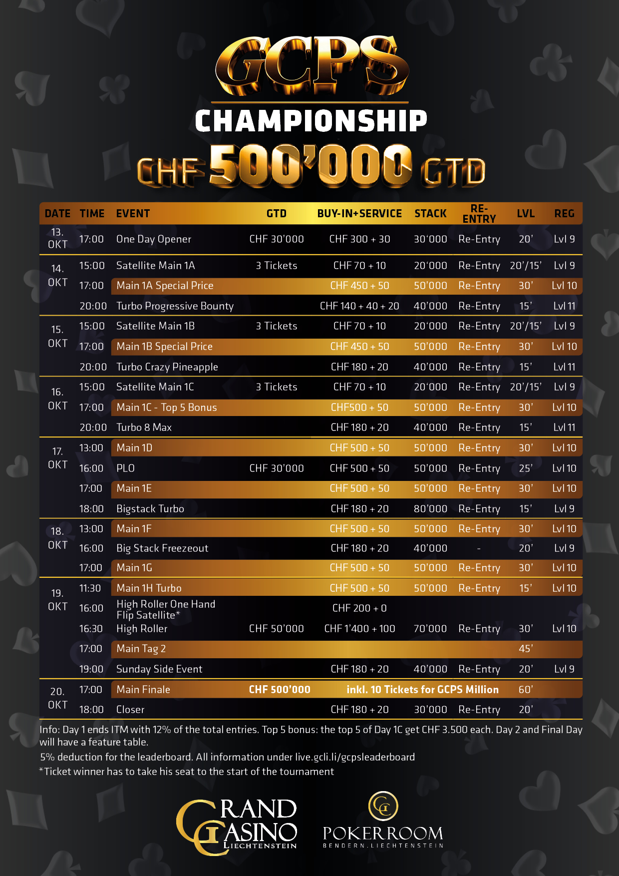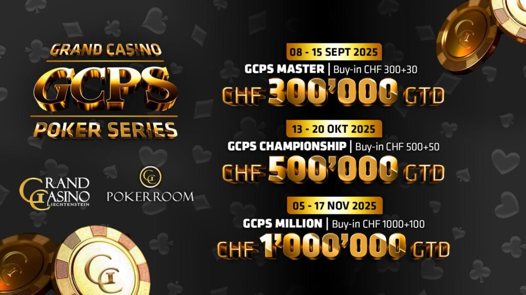 Es ist offensichtlich, dass das Grand Casino Liechtenstein sich äußerst freut, die Turniere im Rahmen der Grand Casino Poker Series zu veranstalten und neben dem €330 GCPS Master vom 8. bis 15. September wird es auch das CHF 550 GCPS Championship vom 13. bis 20. Oktober und das CHF 1.100 GCPS Million vom 5. bis 17. November geben.