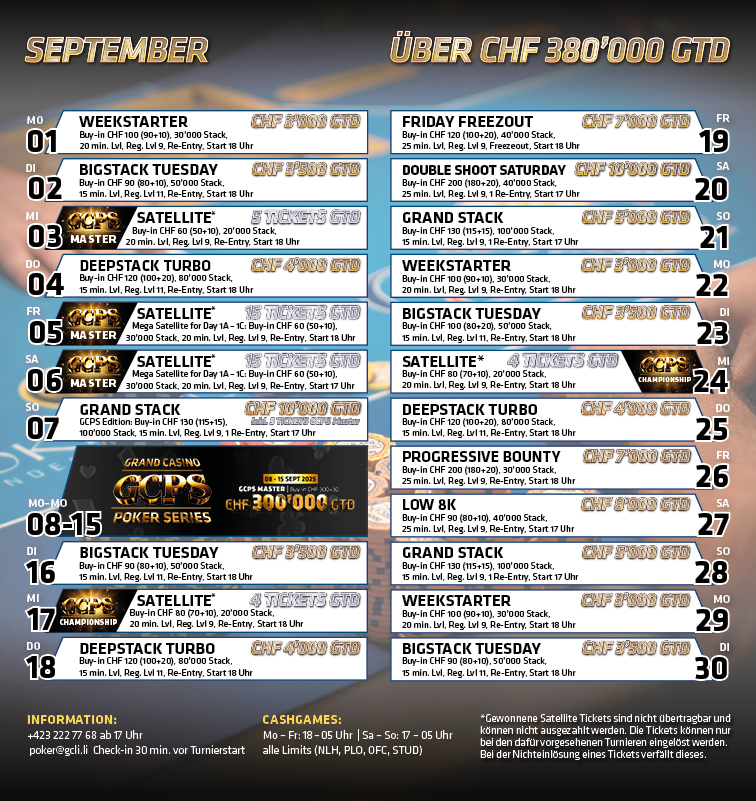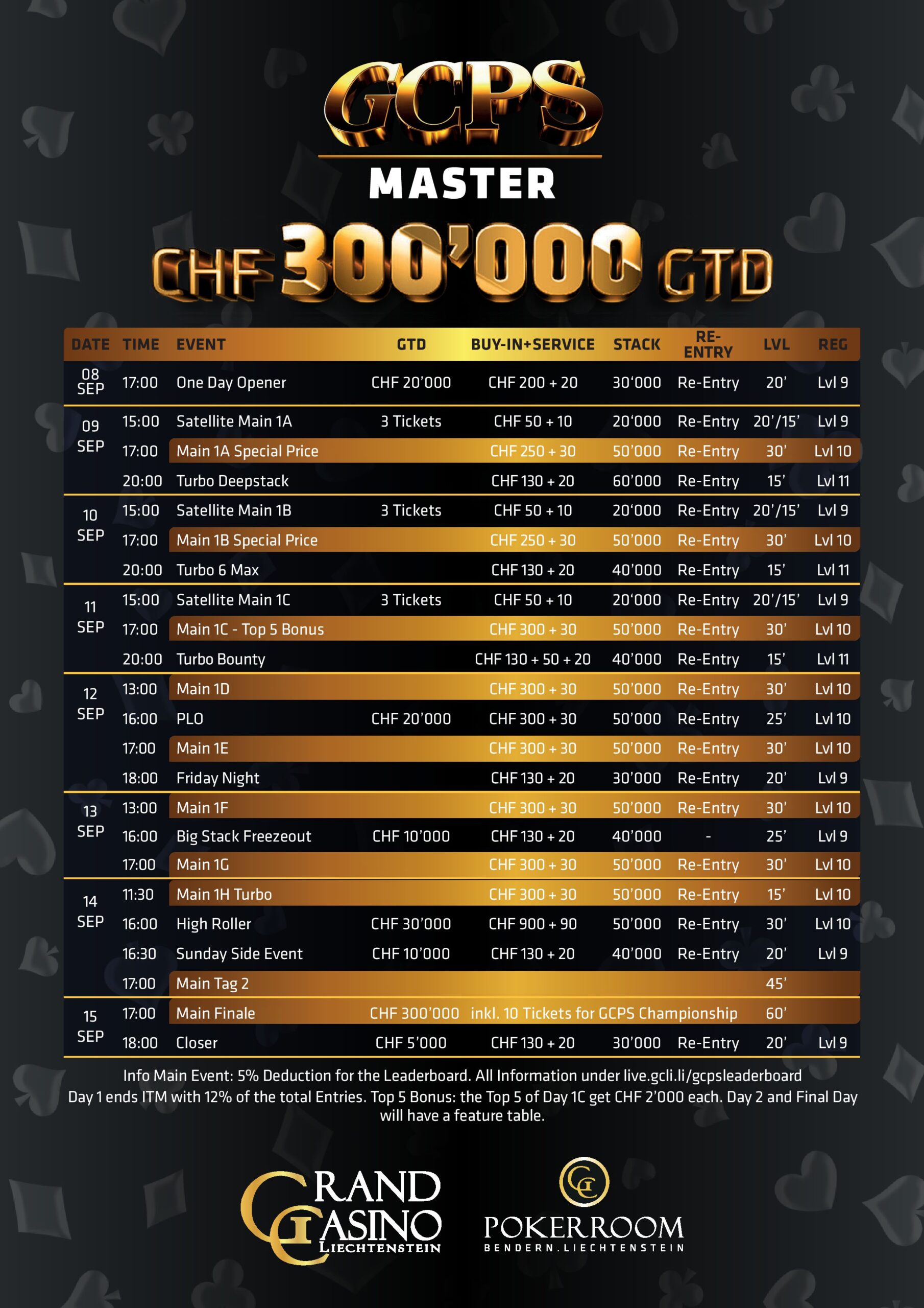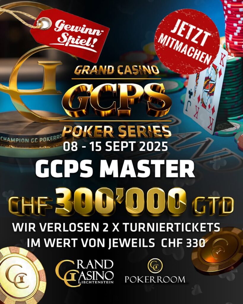 Im Grand Casino Liechtenstein (GCLI) läuft der Countdown für die Grand Casino Poker Series (GCPS), denn schon am Montag geht es los mit dem CHF 300+30 GCPS Masters mit einer CHF 300.000 Garantie.
