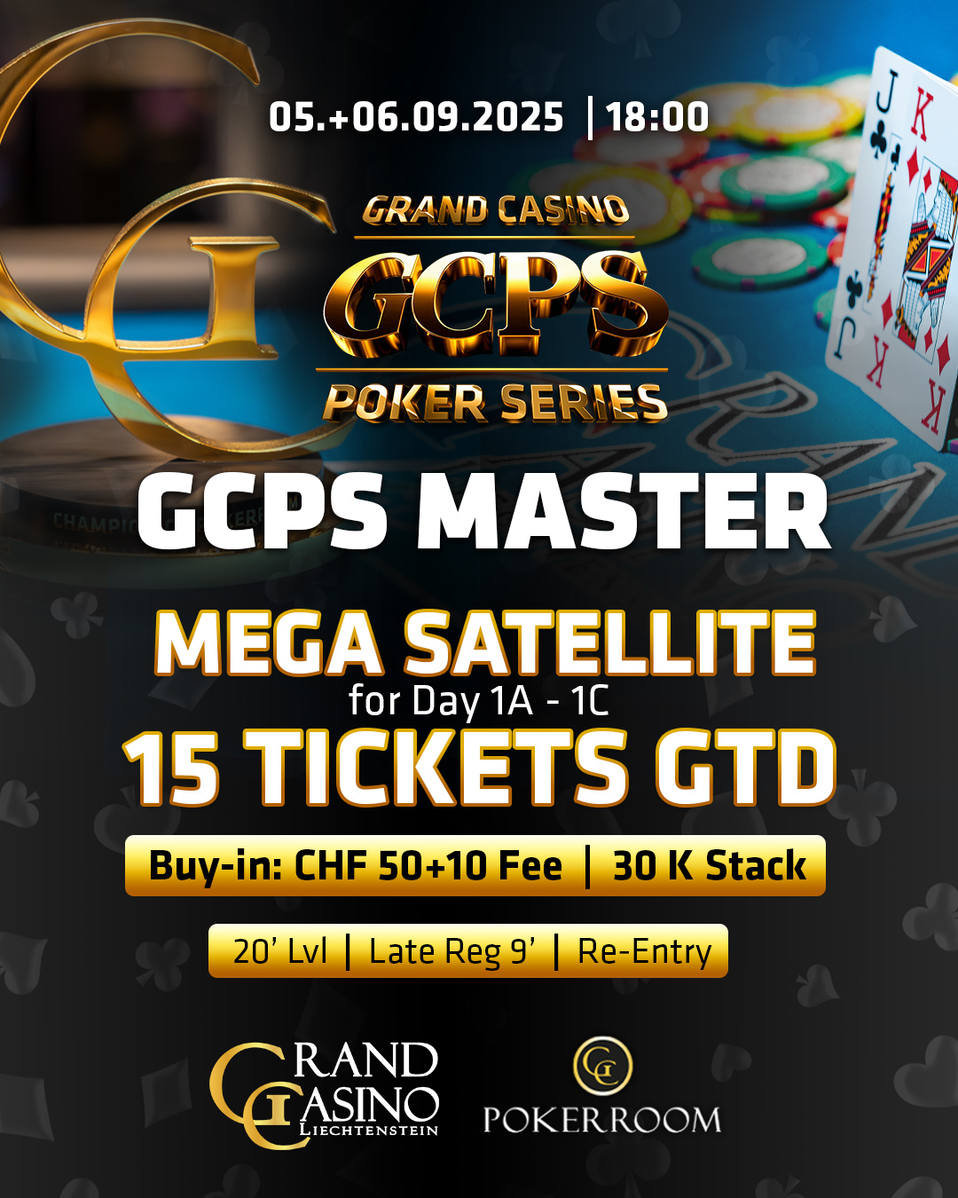 Heute geht es im Grand Casino Liechtenstein um 18:00 Uhr weiter mit einem CHF 50+10 Mega Satellite für den GCPS Master Tag 1A-1C. 15 Tickets werden dabei garantiert und es wird gespielt mit 30.000 Start Stack und 20 Minuten Blind Levels.