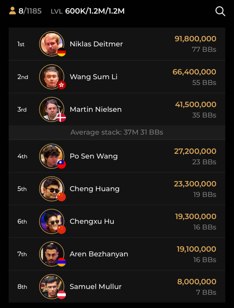 Im Moment haben alle Spieler $54.100 sicher, aber der Fokus liegt natürlich auf dem $564.000 Top-Preis. Besonders erfreulich ist, dass wir noch zwei DACH-Vertreter im Rennen haben und einer davon ist sogar Chipleader.