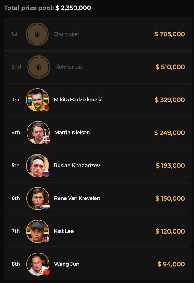 Ins Geld schaffte es in dem Turnier unter anderem Kiat Lee (Platz 7, $120.000), Martin Nielsen (Platz 4, $249.000) und Mikita Badziakouski (Platz 3, $329.0000).