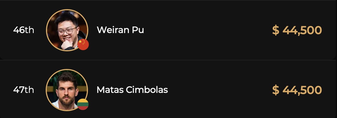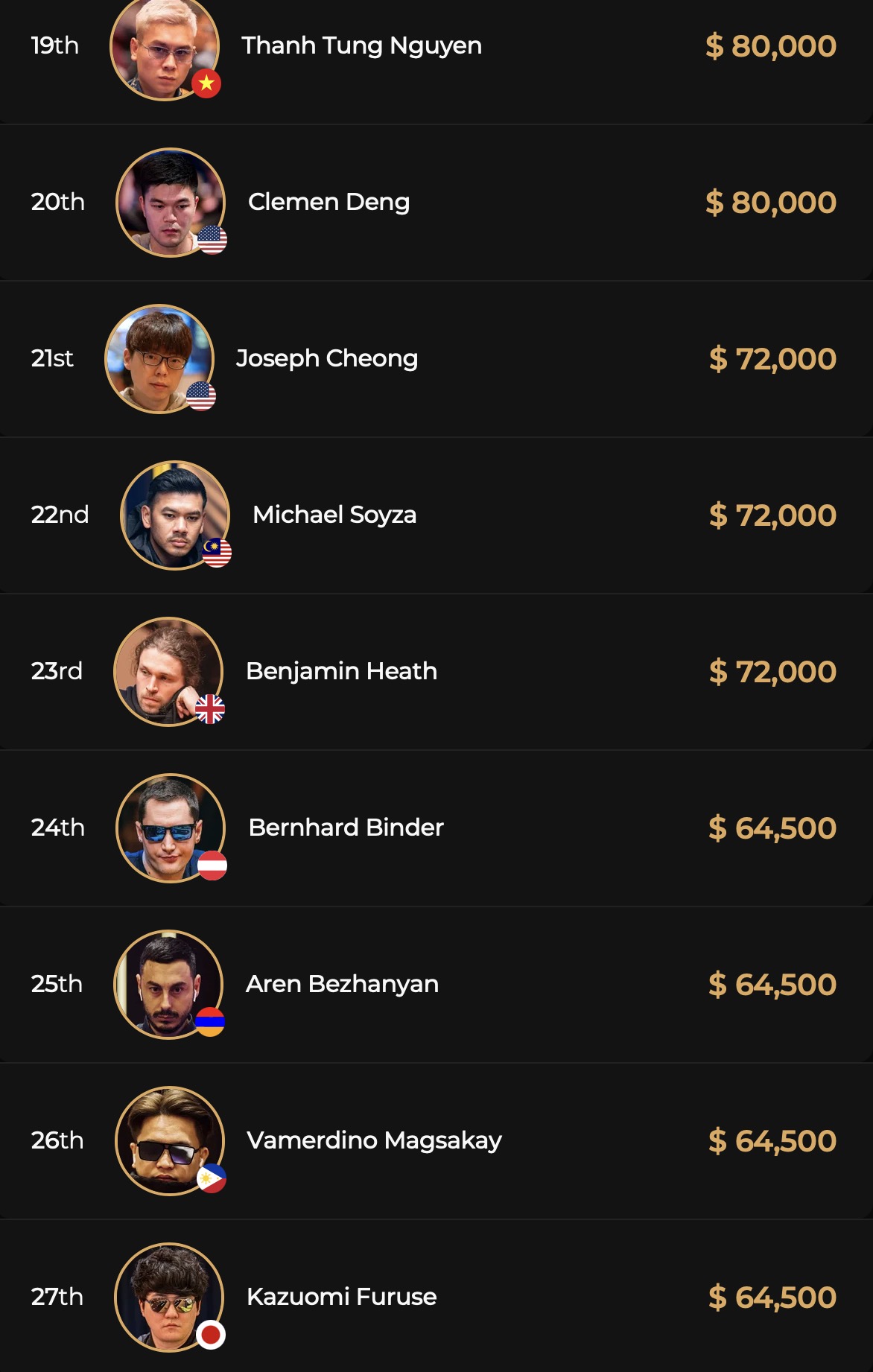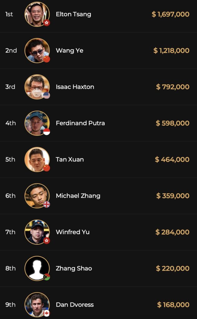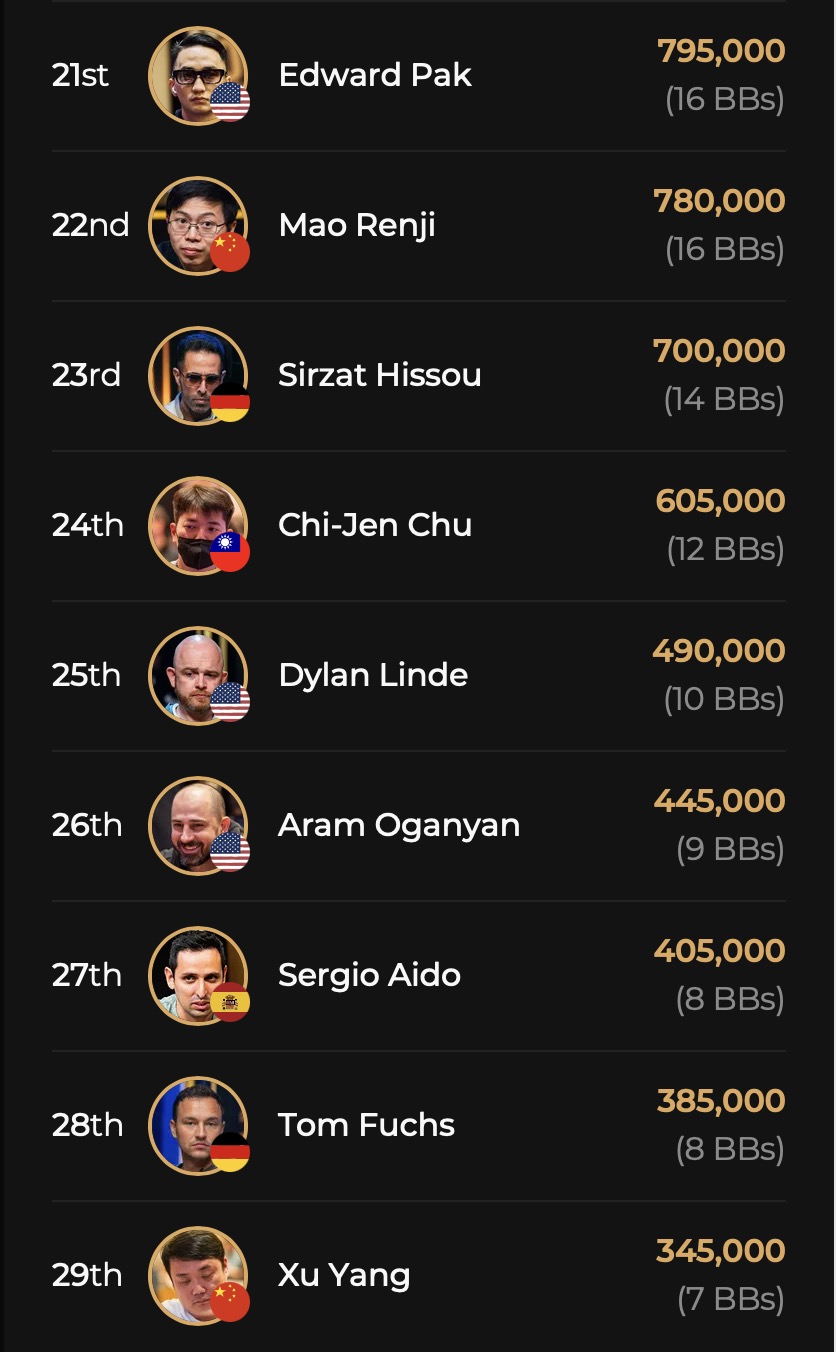 | 2 | Wang Ye | 6,360,000 (127 antes) |