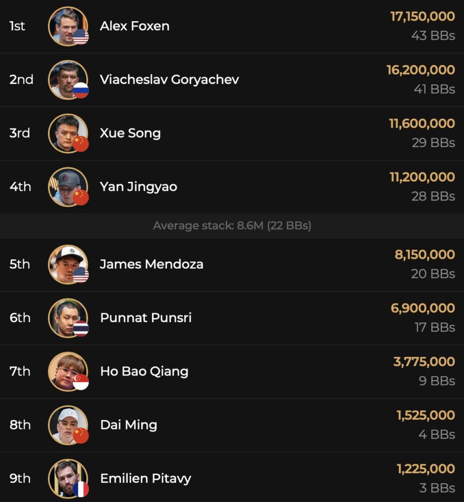 An den Final Table wird Alex Foxen mit 43 BBs als Chipleader gehen. Sollten er oder Punnat Punsri, der mit 17 BBs auf Rang 6 liegt ein Top-Resultat einfahren können, hätten sie sogar die Möglichkeit in der Player-of-the-Year Wertung an Artur Martirosian vorbeizuziehen. Der Chipaverage liegt vor Beginn des Finaltisches bei 8,6 Millionen. Die Blinds werden aller Voraussicht nach am Final Table noch einmal ein „roll back“ erfahren.