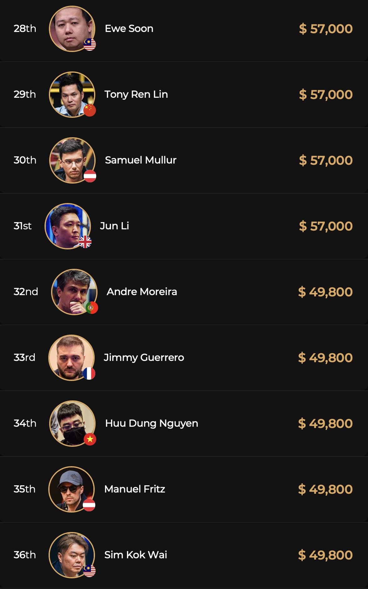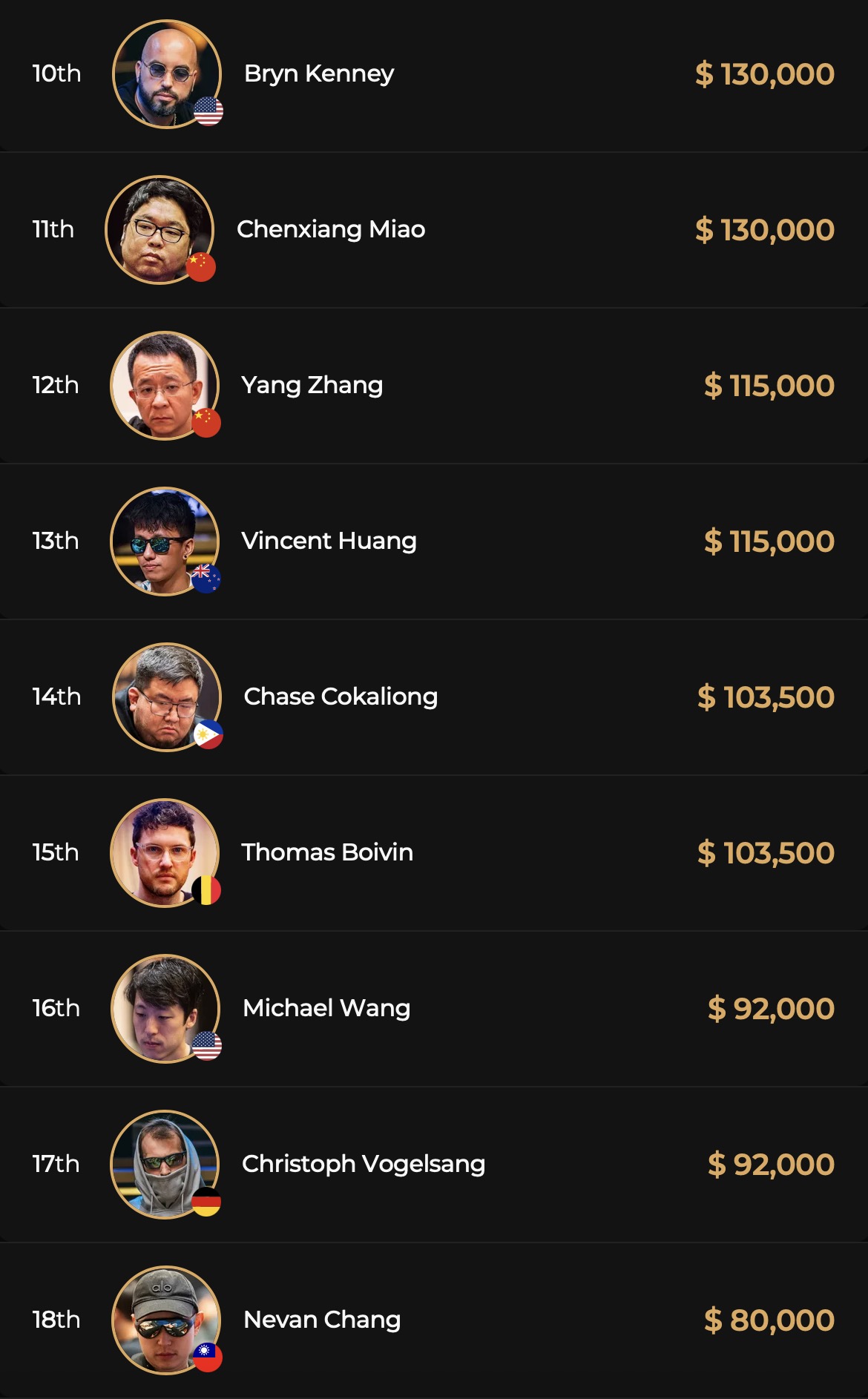 Auf dem Weg zum Finaltisch mussten auch einige deutschsprachige High Roller ihren Platz räumen. Dazu zählten auch Klemens Roiter (42., $44.500), Manuel Fritz (35., $49.800), Samuel Mullur (30., $57.000), Bernhard Binder (24., $64.500). Als bestplatzierter High Roller aus der D-A-CH-L Region schied Christoph Vogelsang auf Rang 17 mit $92.000 Payout aus.
