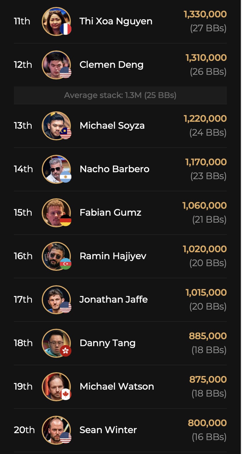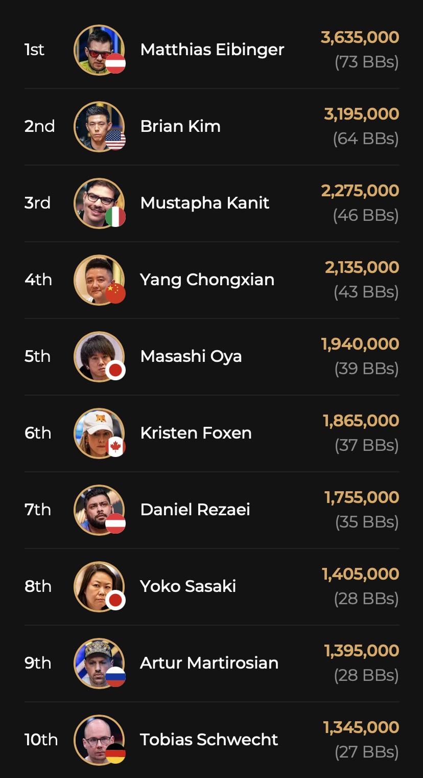 Die beste Ausgangsposition aller Teilnehmer sicherte sich nach Tag 1 Matthias Eibinger. Der Pokercode-Kopf übernachtet mit 3.635.000 Jetons als Tag-1-Chipleader. Mit 73 BBs geht er in Führung in Tag 2. $48.500 haben dann alle bereits die Tag-2-Spieler sicher, zu denen u.a. auch Mustapha Kanit, Kristen Foxen, Artur Martirosian, Nacho Barbero, und Michael Soyza gehören.