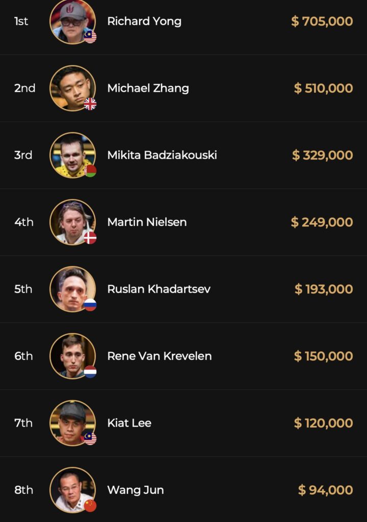 Ins Heads-Up gingen die beiden Kontrahent mit in etwa jeweils 200 Antes nahezu gleichauf. Der deutlich aggressivere Spieler sollte hier Yong sein. Der zweifache Triton Champion gewann ohne Showdown viele Hände und konnte es dann sogar verkraften als er Zhang einmal voll aufdoppelte. Dennoch ließ er das Momentum nicht verstreichen und spielte und bluffte weiterhin viel Hände. Der High Stakes Gambler konnte auch die finale Hand mit T6o gegen KTo gewinnen und sorgte damit für ein weiteres Runner-Up Finish für Michael Zhang, der $510.000 als Trostpflaster einstreichen konnte. Für „Mr. Richard“ wurde es dagegen Triton Titel Nr. 3 und ein $705.000 Zahltag!