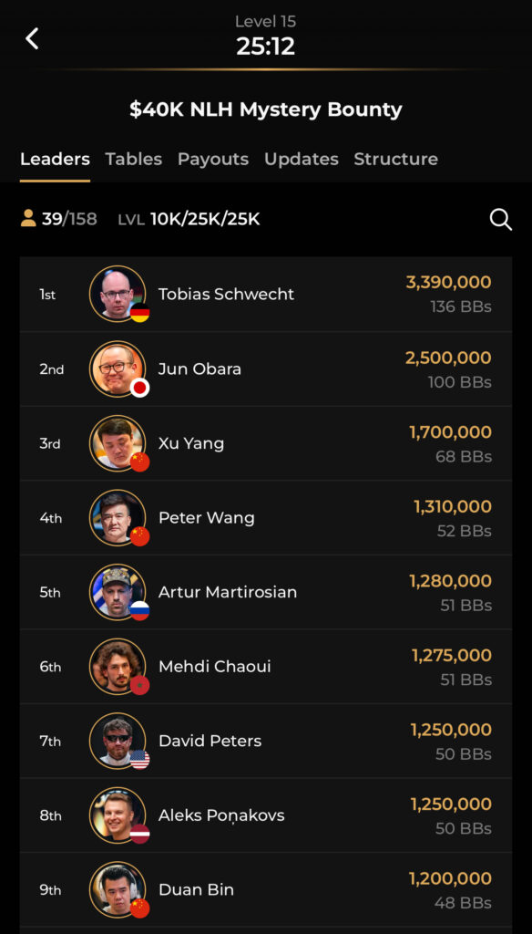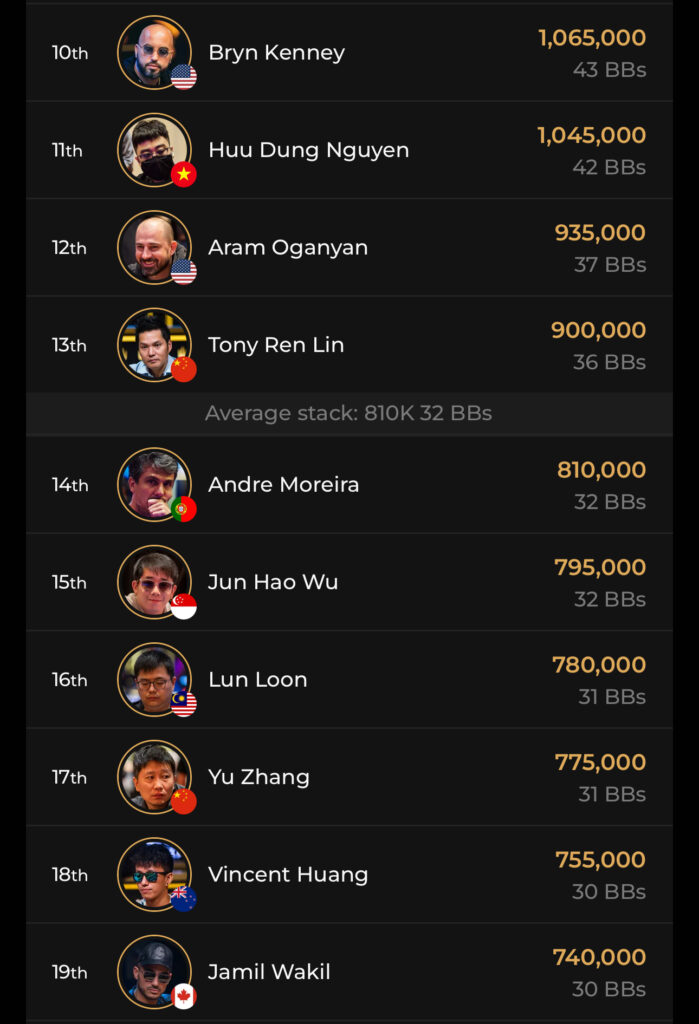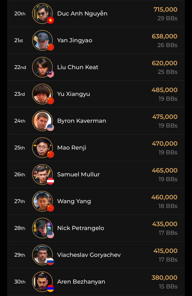 Das Spiel wird heute fortgesetzt, um die Mystery Bounties zu verteilen und den Gewinner des $699.000 Top-Preises zu ermitteln. Für den Moment sind die Spieler noch nicht im Geld, denn nur 27 Plätze werden bezahlt bei einem Min-Cash von $32.000.
