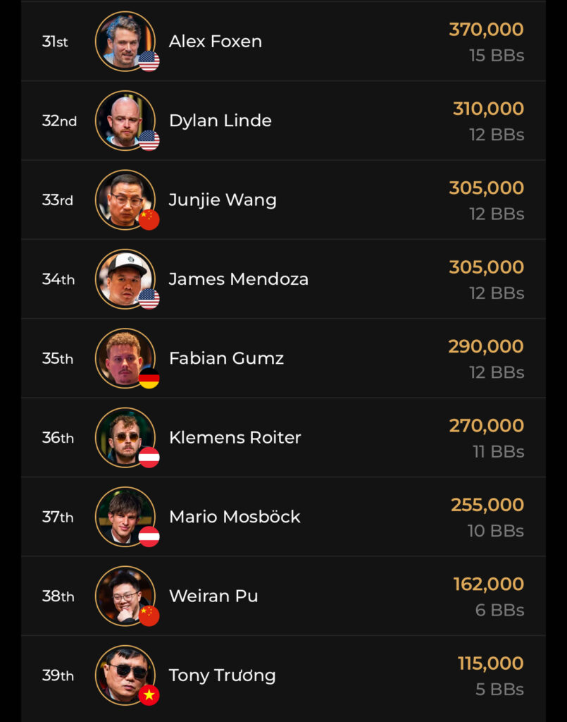 39 Spieler schafften den Sprung ins Finale und darunter waren natürlich ein paar große Namen des Poker-Sports, wie zum Beispiel Alex Foxen, Nick Petrangelo, Ren Lin, Bryn Kenney und David Peters. Aus DACH-Sicht gingen in das Finale: Mario Mosböck (AT auf Rang 37, Klemens Roiter (AT) auf Rang 36, Fabian Gumz (DE) auf Rang 35, Samuel Mullur (AT) auf Rang 26 und Tobias Schwecht (DE) als Chipleader!