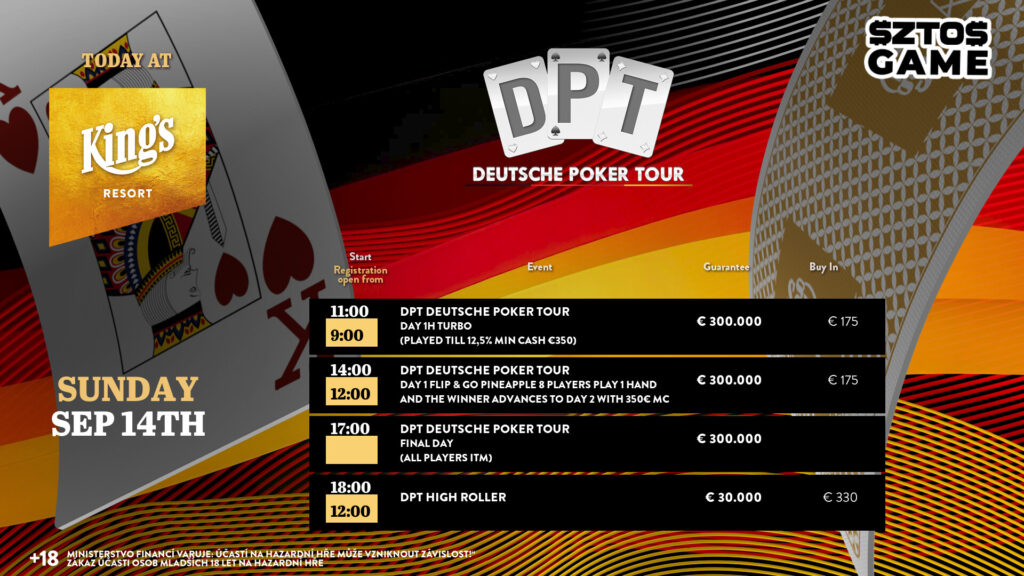 Die Deutsche Poker Tour (DPT) bot am gestrigen Samstag im King’s Resort Rozvadov zwei von insgesamt acht Starttagen und ein zusätzliches Flip & Go.