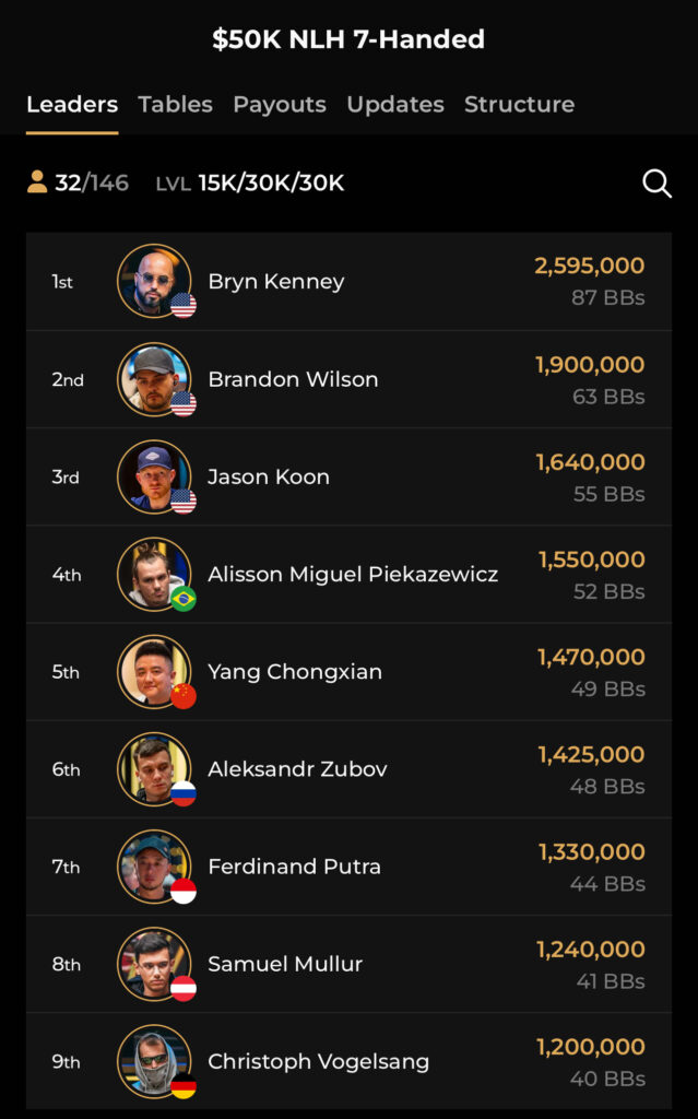 Außerdem ging gestern das Event #6 an den Start. 146 mal wurde das $50.000 Buy-in bezahlt und 32 Spieler verbleiben für das heutige Finale. Ganz oben in den Chipcounts steht Bryn Kenney mit 87 Big Blinds und somit einem guten Vorsprung zu seinem Landsmann Brandon Wilson mit 63 Big Blinds.