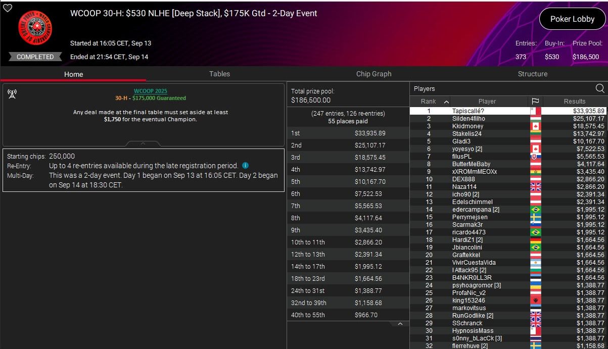 | Sat | 16:30 | WCOOP 70-M: $215 NLHE [Turbo], $125K Gtd |