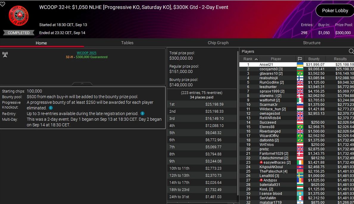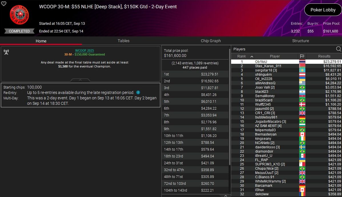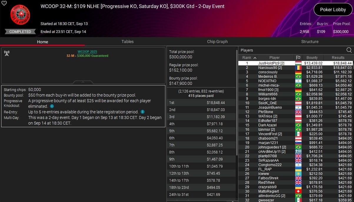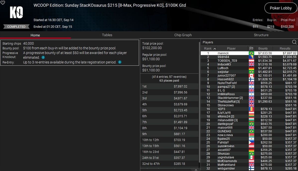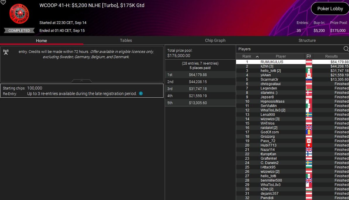 Außer den beiden Siegen gab es auch noch einige Podiumsplatzierungen. So erzielte „consciously“ aus Deutschland beim Event 32-M, einem $109 NLHE PKO, den dritten Platz und kassierte damit rund $15.000 Preisgeld.