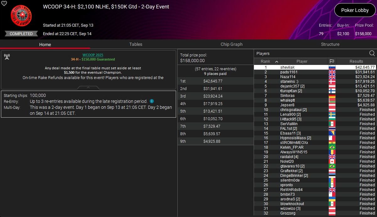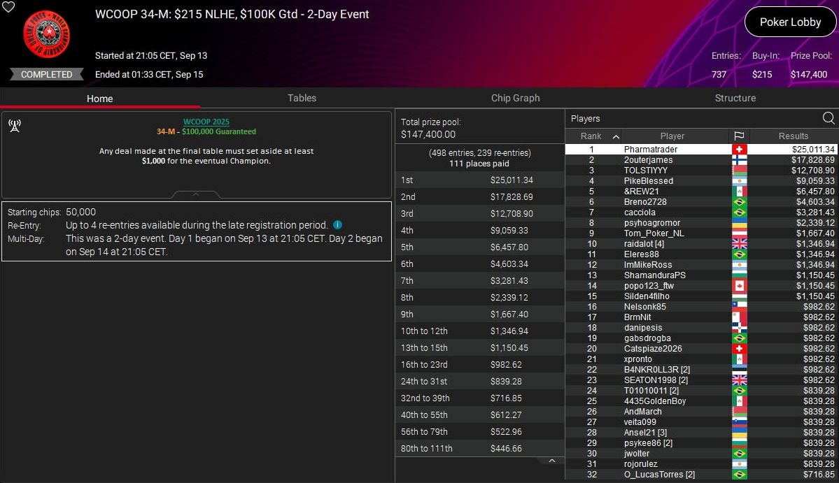 Für den zweiten DACH-Sieg war der Schweizer „Pharmatrader“ verantwortlich. Er ließ bei WCOOP Event 34-M, einem $215 NLHE, 736 Konkurrenten hinter sich und räumte so über $25.000 Preisgeld ab.